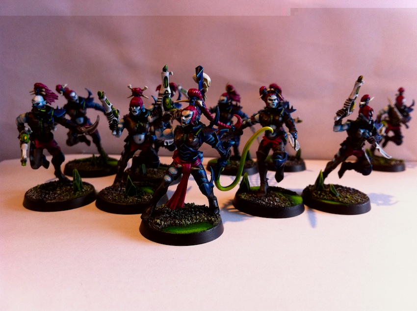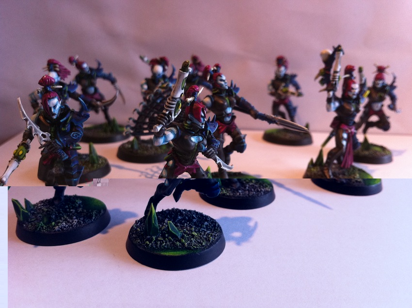Jag har tagit mig i kragen och börjat måla mina dark eldar som har legat och samlat damm sedan i höstas. Planen är att allt ska vara målat och att jag ska ha hunnit spela med dem någon gång (och lärt mig reglerna) efter den här sommaren. Först ut är blåblodiga wyches. De frågetecken som återstår är huruvida de ska få målade ögon, och i så fall i vilken färg. Jag funderar också över gröna eller lila tatueringar, men är orolig för att det kommer att se rörigt ut.
