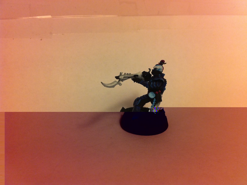 Jag undrar över vad den där runda brickan är som alla warriors har på höften. Jag målade den ljusblå för att få lite balans i färgskalan runt om hela figuren, men jag skulle vilja veta vad det är om någon har någon bra gissning. Gevären ska målas som pistolerna, med ljusgrå blad där fram. Jag kommer nog vänta med att måla baserna tills jag har tjugo warriors som jag kan basa samtidigt.